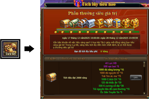 1. Trong thời gian hoạt động, vàng Thuyền Trưởng tiêu trong game đều sẽ được tích lũy, đạt đến mức tiêu vàng theo yêu cầu là có thể nhấn vào nút “lĩnh” để nhận thưởng