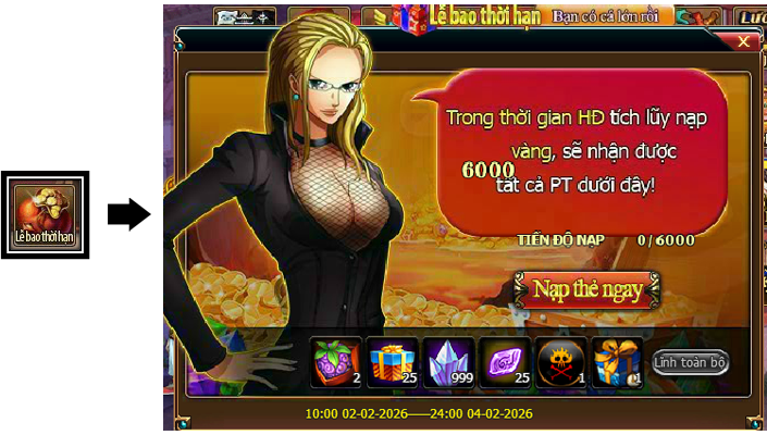 Trong thời gian diễn ra hoạt động, mức nạp thẻ tích lũy của Thuyền Trưởng đạt 6000 vàng thì có thể lĩnh toàn bộ phần thưởng trong giao diện hoạt động.