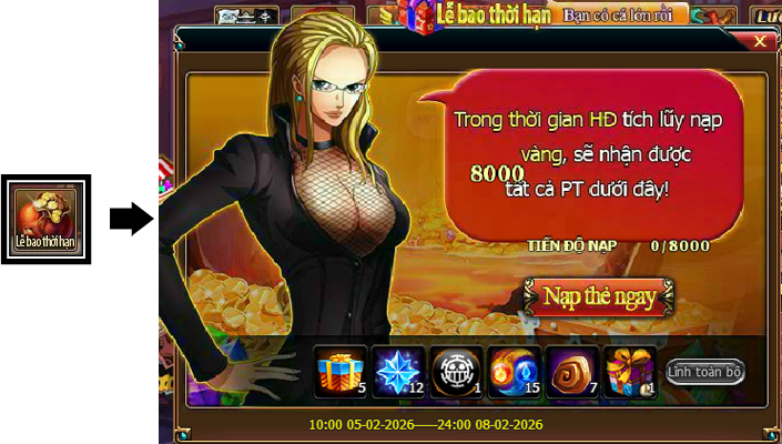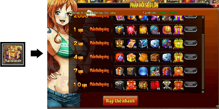 Trong thời gian diễn ra hoạt động, mức nạp thẻ tích lũy của Thuyền Trưởng đạt 8000 vàng thì có thể lĩnh toàn bộ phần thưởng trong giao diện hoạt động.