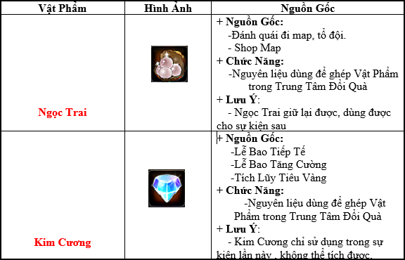 - Trong thời gian hoạt động người chơi thu thập các vật phẩm sau :
