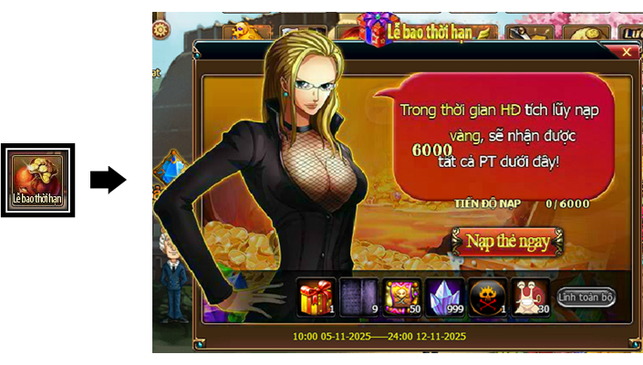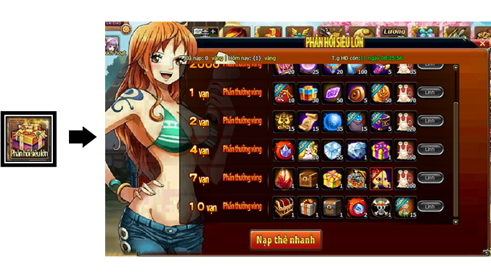 Trong thời gian diễn ra hoạt động, mức nạp thẻ tích lũy của Thuyền Trưởng đạt 6000 vàng thì có thể lĩnh toàn bộ phần thưởng trong giao diện hoạt động.