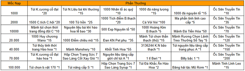Trong thời gian diễn ra hoạt động, mức nạp thẻ tích lũy của Thuyền Trưởng đạt 8000 vàng thì có thể lĩnh toàn bộ phần thưởng trong giao diện hoạt động.
