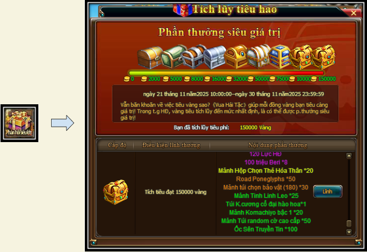 1. Trong thời gian hoạt động, vàng Thuyền Trưởng tiêu trong game đều sẽ được tích lũy, đạt đến mức tiêu vàng theo yêu cầu là có thể nhấn vào nút “lĩnh” để nhận thưởng