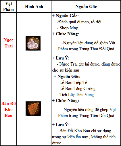 • Trong thời gian hoạt động người chơi thu thập các vật phẩm sau: