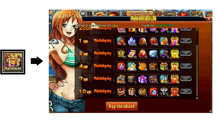 1. Trong thời gian hoạt động, vàng Thuyền Trưởng nạp đều sẽ được tích lũy, đạt đến mức vàng yêu cầu, là có thể nhấn vào nút “lĩnh” để nhận thưởng