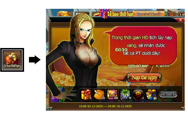 Trong thời gian diễn ra hoạt động, mức nạp thẻ tích lũy của Thuyền Trưởng đạt 6000 vàng thì có thể lĩnh toàn bộ phần thưởng trong giao diện hoạt động.
