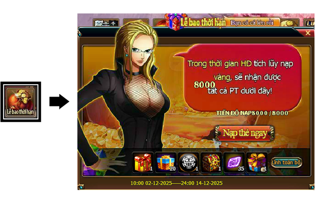 Trong thời gian diễn ra hoạt động, mức nạp thẻ tích lũy của Thuyền Trưởng đạt 8000 vàng thì có thể lĩnh toàn bộ phần thưởng trong giao diện hoạt động.