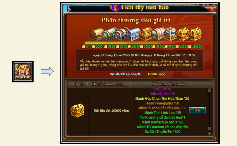 1. Trong thời gian hoạt động, vàng Thuyền Trưởng tiêu trong game đều sẽ được tích lũy, đạt đến mức tiêu vàng theo yêu cầu là có thể nhấn vào nút “lĩnh” để nhận thưởng