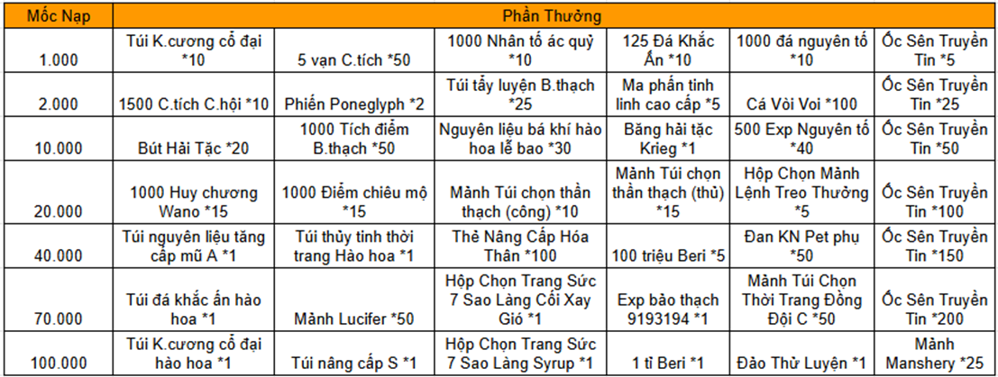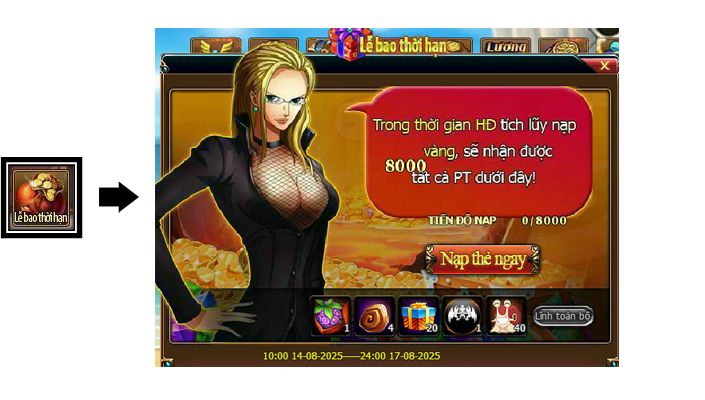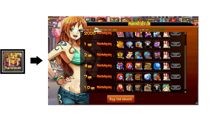 Trong thời gian diễn ra hoạt động, mức nạp thẻ tích lũy của Thuyền Trưởng đạt 8000 vàng thì có thể lĩnh toàn bộ phần thưởng trong giao diện hoạt động.