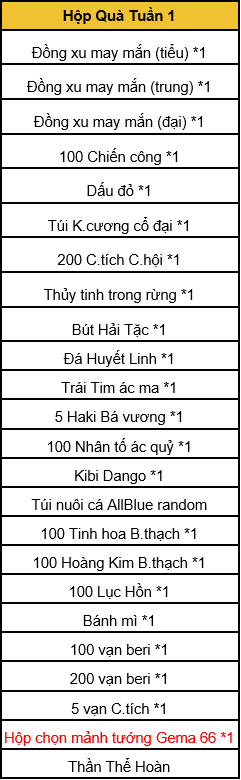 2. Sử dụng “Hộp Quà Tuần 1” có thể nhận vật phẩm ngẫu nhiên (danh sách vật phẩm bên duới)