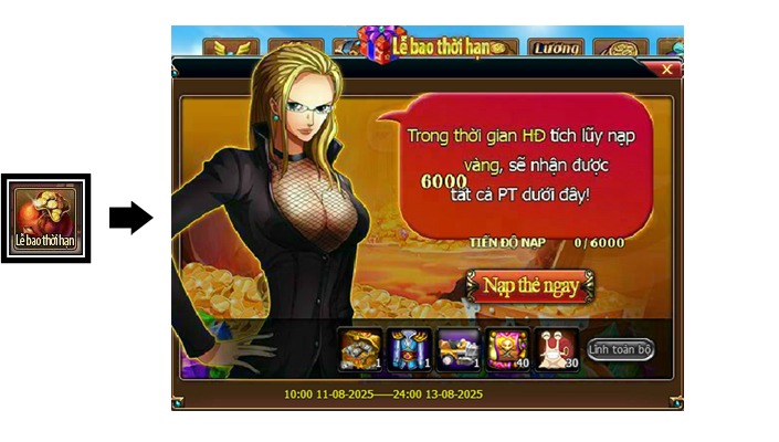 Trong thời gian diễn ra hoạt động, mức nạp thẻ tích lũy của Thuyền Trưởng đạt 6000 vàng thì có thể lĩnh toàn bộ phần thưởng trong giao diện hoạt động.