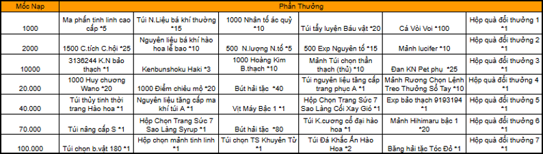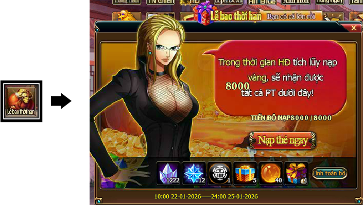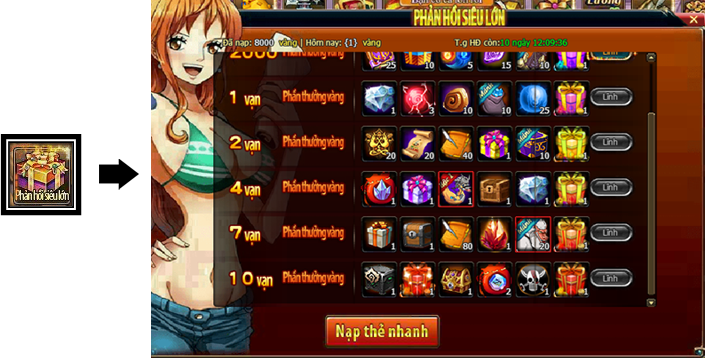 Trong thời gian diễn ra hoạt động, mức nạp thẻ tích lũy của Thuyền Trưởng đạt 8000 vàng thì có thể lĩnh toàn bộ phần thưởng trong giao diện hoạt động.