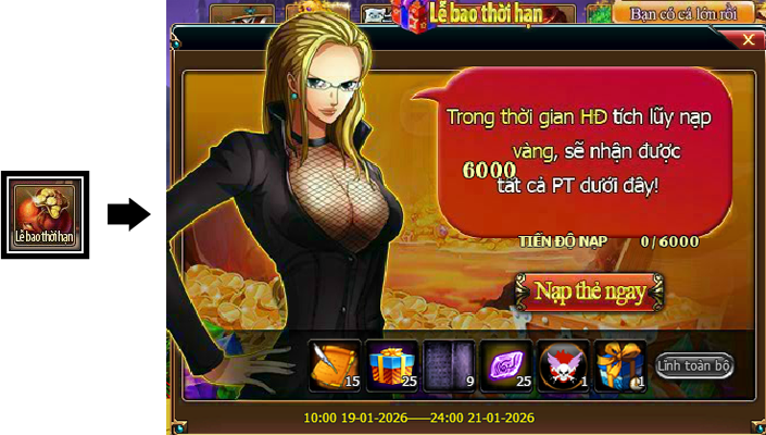 Trong thời gian diễn ra hoạt động, mức nạp thẻ tích lũy của Thuyền Trưởng đạt 6000 vàng thì có thể lĩnh toàn bộ phần thưởng trong giao diện hoạt động.