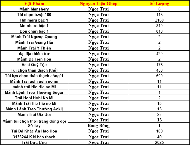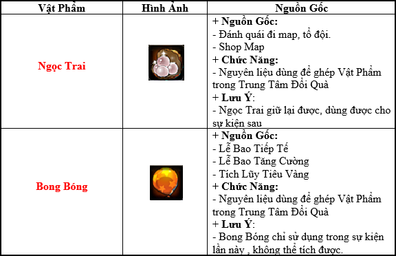 - Trong thời gian hoạt động người chơi thu thập các vật phẩm sau :