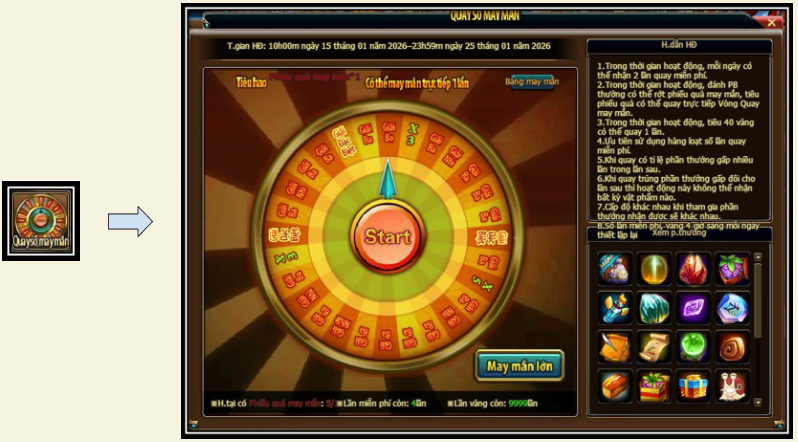 Chú ý: Khi quay “May mắn lớn”, số lần quay phải ít hơn số ô trống của túi đồ (VD: quay 40 lần thì số ô trống trong túi phải là 41)