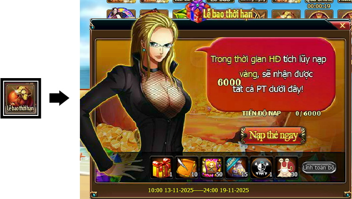Trong thời gian diễn ra hoạt động, mức nạp thẻ tích lũy của Thuyền Trưởng đạt 6000 vàng thì có thể lĩnh toàn bộ phần thưởng trong giao diện hoạt động.