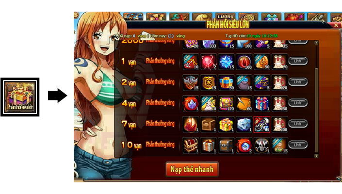1. Trong thời gian hoạt động, vàng Thuyền Trưởng nạp đều sẽ được tích lũy, đạt đến mức vàng yêu cầu, là có thể nhấn vào nút “lĩnh” để nhận thưởng