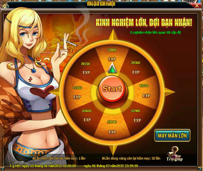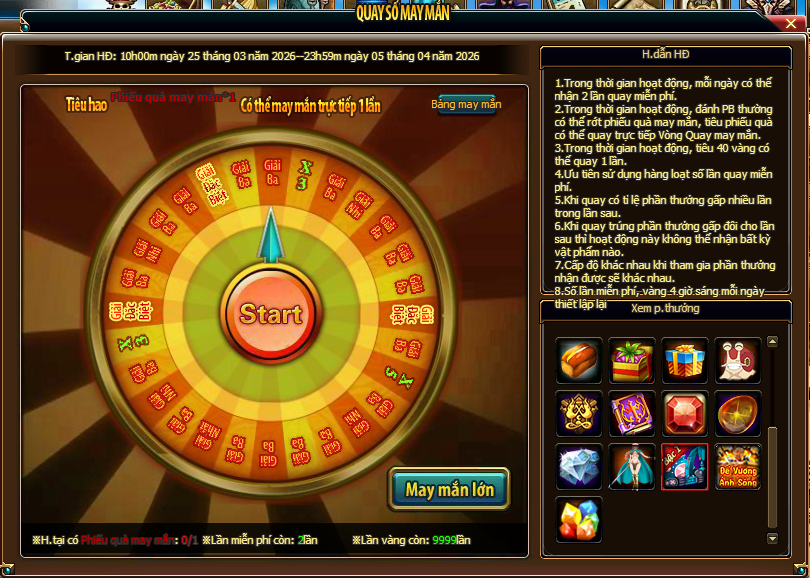 Chú ý: Khi quay “May mắn lớn”, số lần quay phải ít hơn số ô trống của túi đồ (VD: quay 40 lần thì số ô trống trong túi phải là 41)