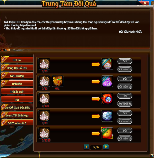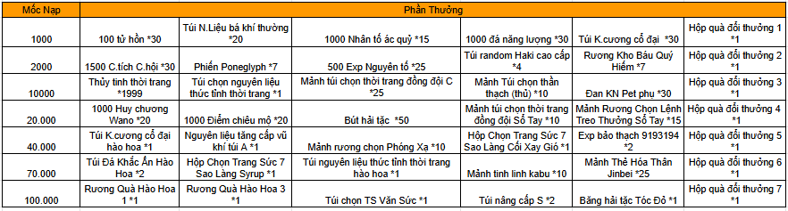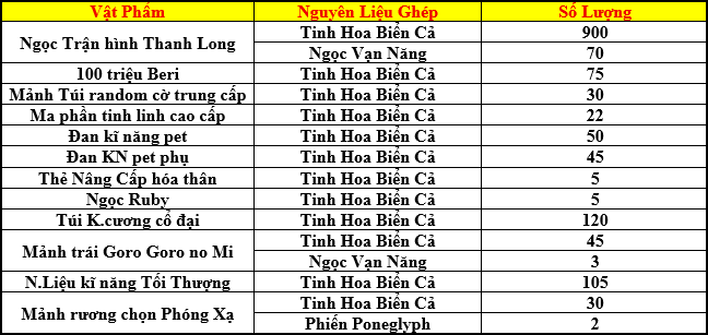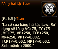 Ngọc Vạn Năng*3 Nguyên liệu bá khí hào hoa lễ bao*40 1000 Hoàng Kim B.thạch*7 500 Tinh hoa B.thạch*15 Băng Hải Tặc Law *1 Hộp quà Lễ Bao 2 *1