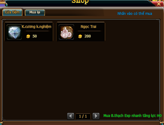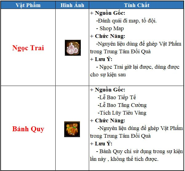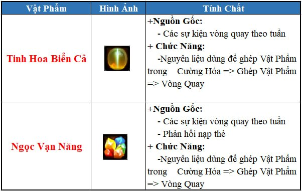 Trong thời gian hoạt động người chơi thu thập các vật phẩm sau