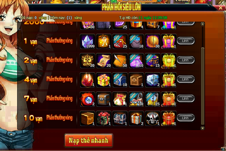 Điểm danh 4 lần Bút Hải Tặc *5, 200 Hoàng Kim B.Thạch *4, 300 Đá Hải Hồn *5, Đồng xu may mắn (trung) *2