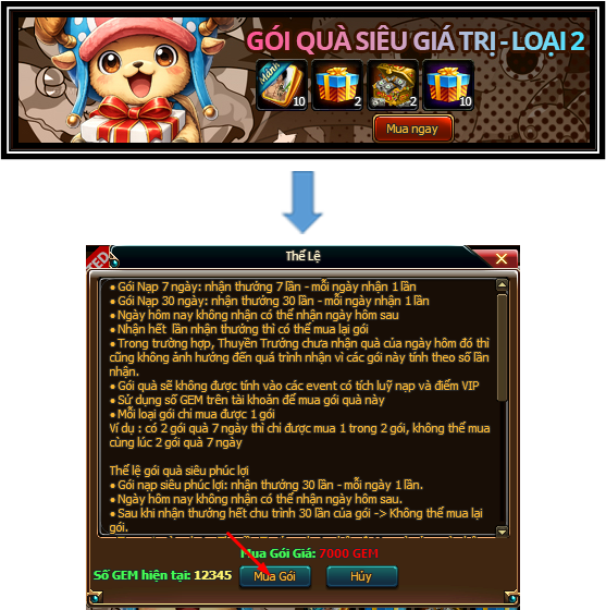 Lưu ý: Thuyền Trưởng vui lòng đảm bảo có đủ số lượng Gem trong tài khoản trước khi xác nhận mua gói thì giao dịch mới thành công