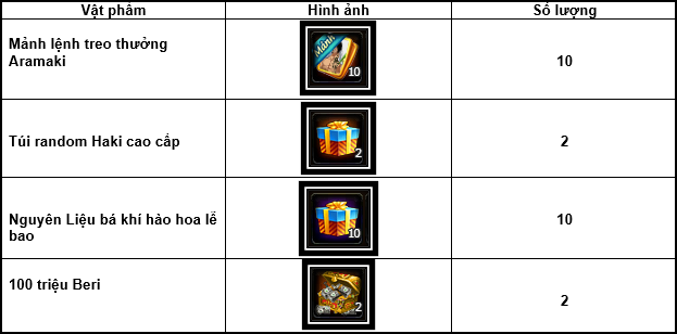 Thuyền Trưởng sẽ nhận các phần thưởng sau trong 10 lần
