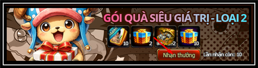 Trong game, Thuyền Trưởng vào tính năng “Trung Tâm Phần Thưởng” -> “Gói Quà Siêu Giá Trị - Loại 2”