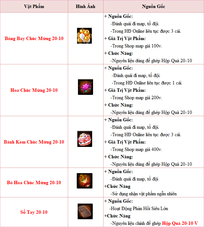 • Trong thời gian hoạt động người chơi thu thập các vật phẩm sau