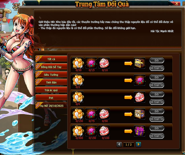 • Khuyến cáo các thuyền trưởng nên đổi lần lượt từng vật phẩm , hạn chế đổi toàn bộ để đề phòng tránh tổn thất không đáng có
