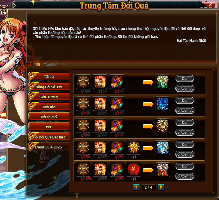 - Khuyến cáo các thuyền trưởng nên đổi lần lượt từng vật phẩm, hạn chế đổi toàn bộ để đề phòng tránh tổn thất không đáng có
