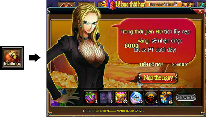Trong thời gian diễn ra hoạt động, mức nạp thẻ tích lũy của Thuyền Trưởng đạt 6000 vàng thì có thể lĩnh toàn bộ phần thưởng trong giao diện hoạt động.