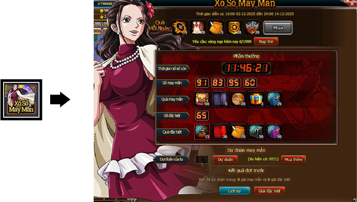 1. Trong thời gian hoạt động, 10h00 hằng ngày tiến hành dự đoán số may mắn bằng Xu Dự Đoán. 21h30 hằng ngày sẽ tiến hành Xổ Số. Kết quả Xổ số sẽ có 4 Số May Mắn và 1 Số Đặc Biệt