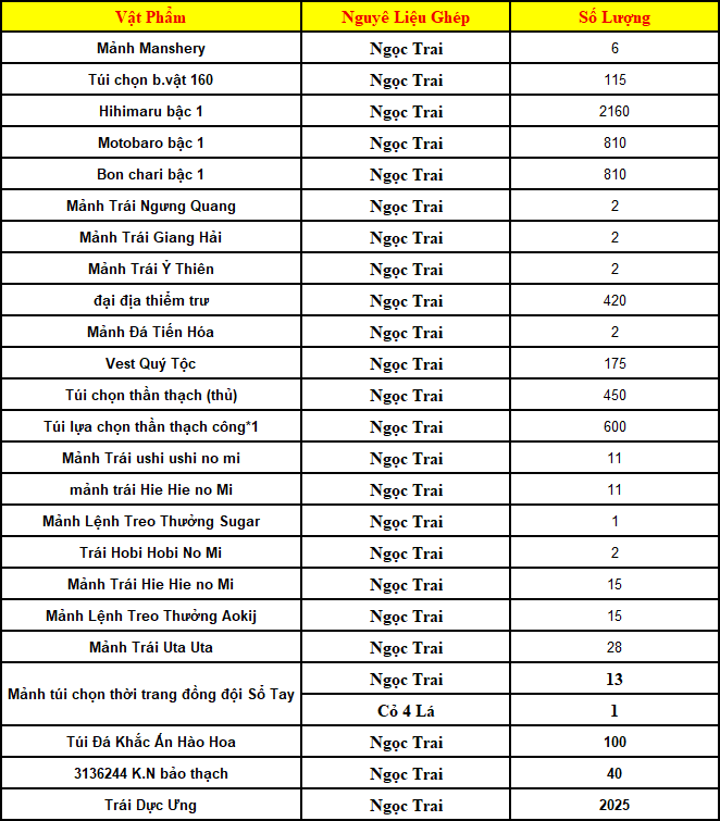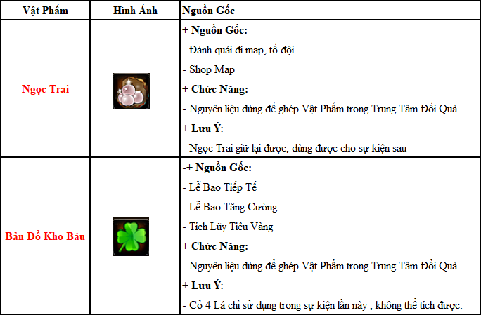 - Trong thời gian hoạt động người chơi thu thập các vật phẩm sau :