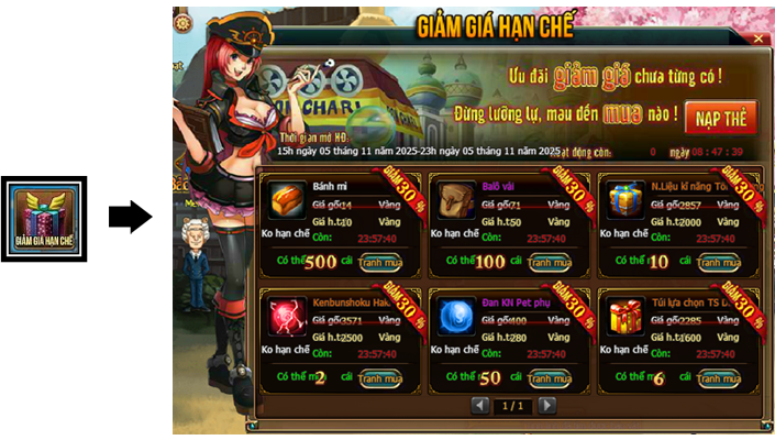 1. Trong thời gian hoạt động, Thuyền Trưởng thông qua giao diện hoạt động để tiến hành mua vật phẩm giảm giá trong game