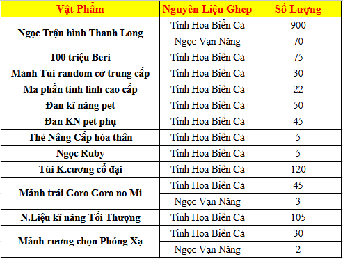 - Vật phẩm của hoạt động sẽ gửi trực tiếp “Túi Đồ” của Thuyền Trưởng
