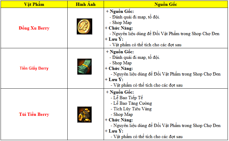 - Trong thời gian hoạt động người chơi thu thập các vật phẩm sau:
