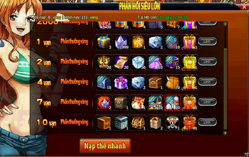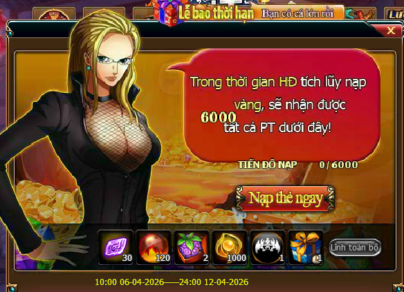 - Trong thời gian diễn ra hoạt độn g, mức nạp thẻ tích lũy của Thuyền Trưởng đạt 6000 vàng thì có thể lĩnh toàn bộ phần thưởng trong giao diện hoạt động.