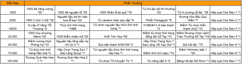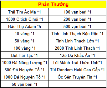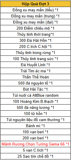 | Hạt Kinh Nghiệm *1000 | Băng Hải Tặc Moria *1 | Hộp quà Lễ Bao 1 *1 |