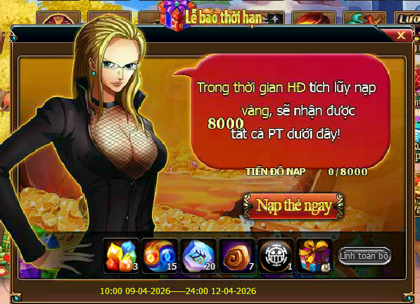 - Trong thời gian diễn ra hoạt độn g, mức nạp thẻ tích lũy của Thuyền Trưởng đạt 8 000 vàng thì có thể lĩnh toàn bộ phần thưởng trong giao diện hoạt động.