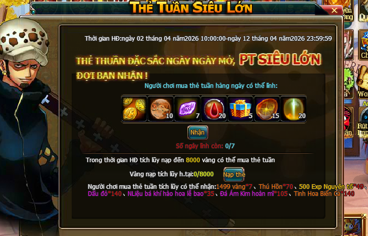 - Trong thời gian hoạt động diễn ra, sau khi mua thẻ tuần thì Thuyền Trưởng có 7 lần lĩnh, mỗi ngày nhiều nhất có thể lĩnh 1 lần