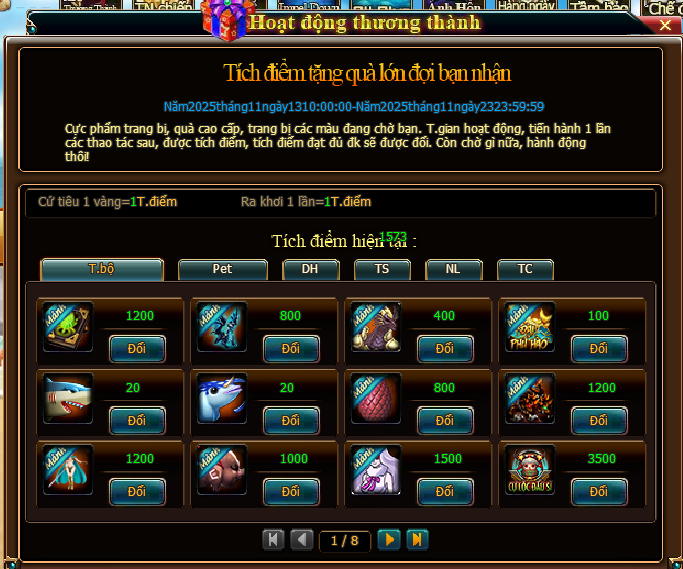 - Trong thờ i gian diễn ra hoạt động, Thuyền Trưở ng tiêu 1 vàng thì nhận được 1 tích, điểm, tích điểm có thể dùng để đổi vật phẩ m tương ứ ng