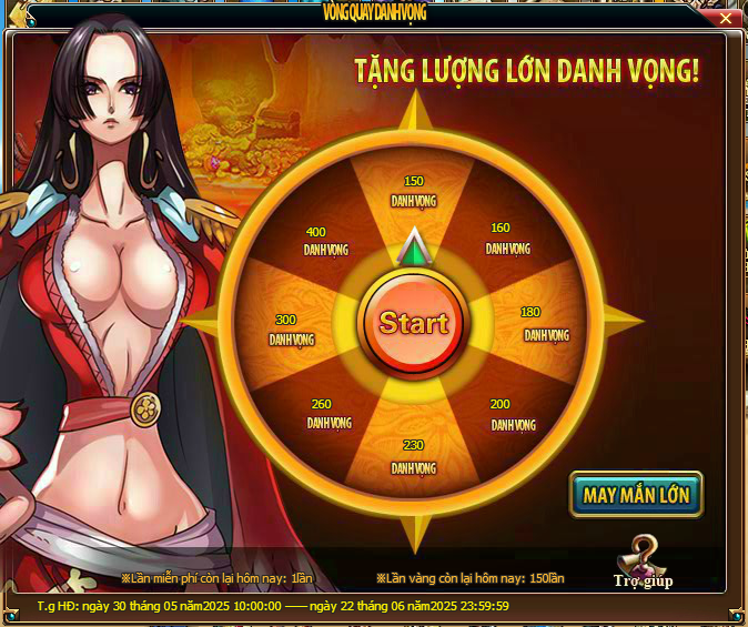 - Danh vọng nhận được sau vòng quay danh vọng là: danh vọng hiện trên vòng quay * bội số lĩnh, mặc định là 1 lần (miễn phí), bội số lớn hơn cầ n tiêu vàng