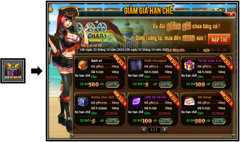 1. Trong thời gian hoạt động, Thuyền Trưởng thông qua giao diện hoạt động để tiến hành mua vật phẩm giảm giá trong game