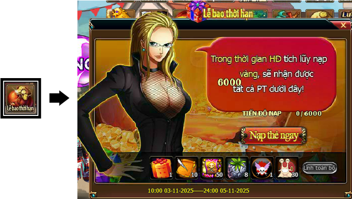 Trong thời gian diễn ra hoạt động, mức nạp thẻ tích lũy của Thuyền Trưởng đạt 6000 vàng thì có thể lĩnh toàn bộ phần thưởng trong giao diện hoạt động.