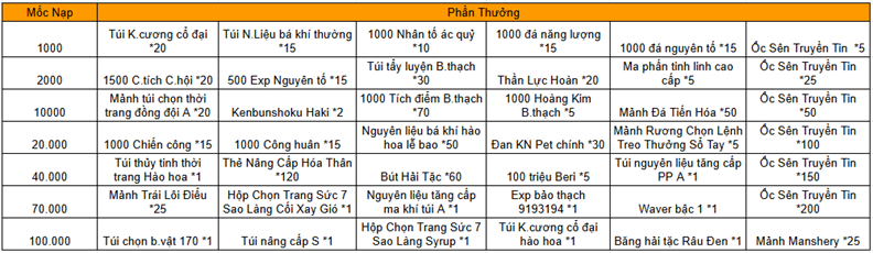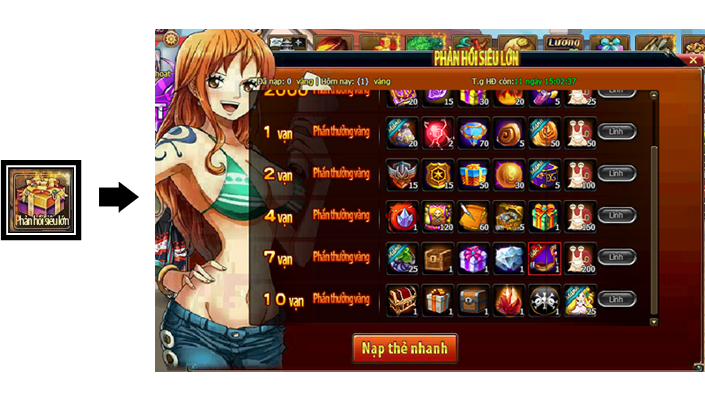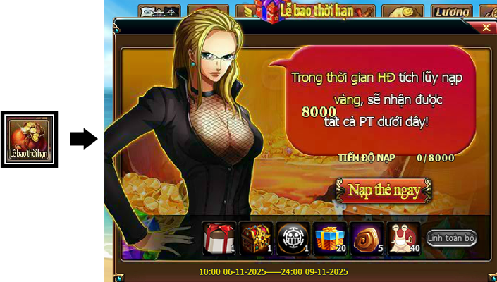 Trong thời gian diễn ra hoạt động, mức nạp thẻ tích lũy của Thuyền Trưởng đạt 8000 vàng thì có thể lĩnh toàn bộ phần thưởng trong giao diện hoạt động.
