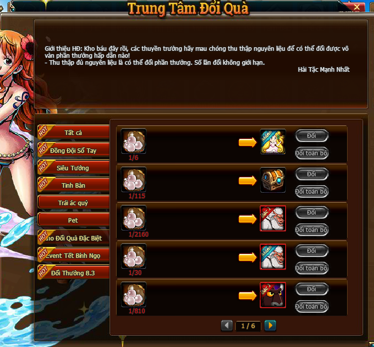 Chú ý: Khuyến cáo các thuyền trưởng nên đổi lần lượt từng vật phẩm, hạn chế đổi toàn bộ để đề phòng tránh tổn thất không đáng có