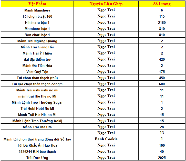 Danh sách vật phẩm: