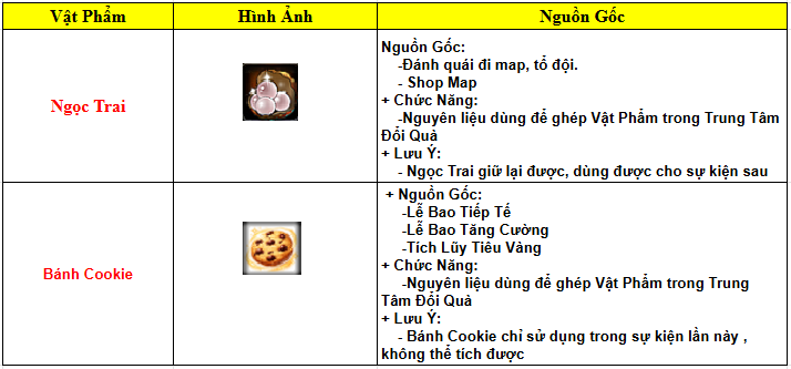Trong thời gian hoạt động người chơi thu thập các vật phẩm sau: