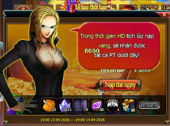 - Trong thời gian diễn ra hoạt độn g, mức nạp thẻ tích lũy của Thuyền Trưởng đạt 6000 vàng thì có thể lĩnh toàn bộ phần thưởng trong giao diện hoạt động.